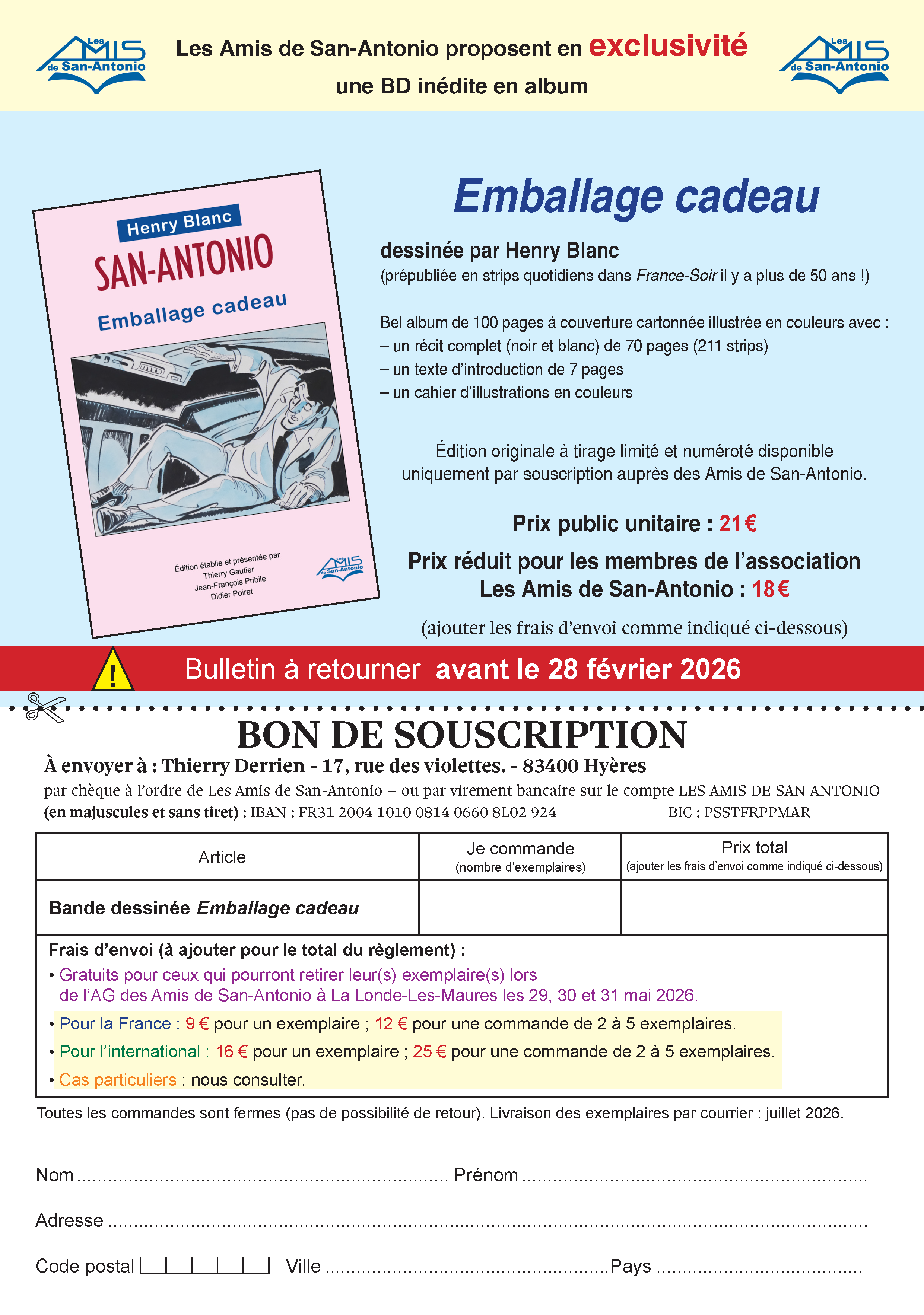 juin 2026 : Emballage cadeau - BD rééditée par Les Amis de San-Antonio - Souscription jusqu'au 28 février